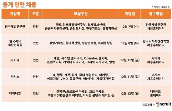 가비아에서 동계인턴을 모집한다. 채용 중인 직무는 개발, 시스템 엔지니어, Operator, 웹기획, 콘텐츠기획, 캐릭터 디자이너, 그래픽 디자이너, 영업이다. 인턴 기간의 평가 결과에 따라 정규직으로 최종 전환될 수 있는 채용전제형 인턴이다. 공통 지원자격은 4년제 정규 대학 이상 기 졸업자 및 2017년 상반기 졸업예정자, 모집부문에 해당되는 학과 또는 관련 학과를 전공한 자, 남자의 경우 병역을 마친 자 또는 면제된 자로 해외여행에 결격사유가 없는 자이다. 모집부문 별로 전공요건과 필요역량, 우대사항이 상이하니 인크루트 홈페이지 내 가비아 공고를 참고할 것. 전형은 서류접수> 서류평가> 인적성검사> 실무진면접> 임원면접> 최종입사 순으로 진행된다. 지원희망자는 11일까지 가비아 채용 홈페이지를 방문해 지원양식에 맞춰 입사지원서와 자기소개서를 제출하면 된다.