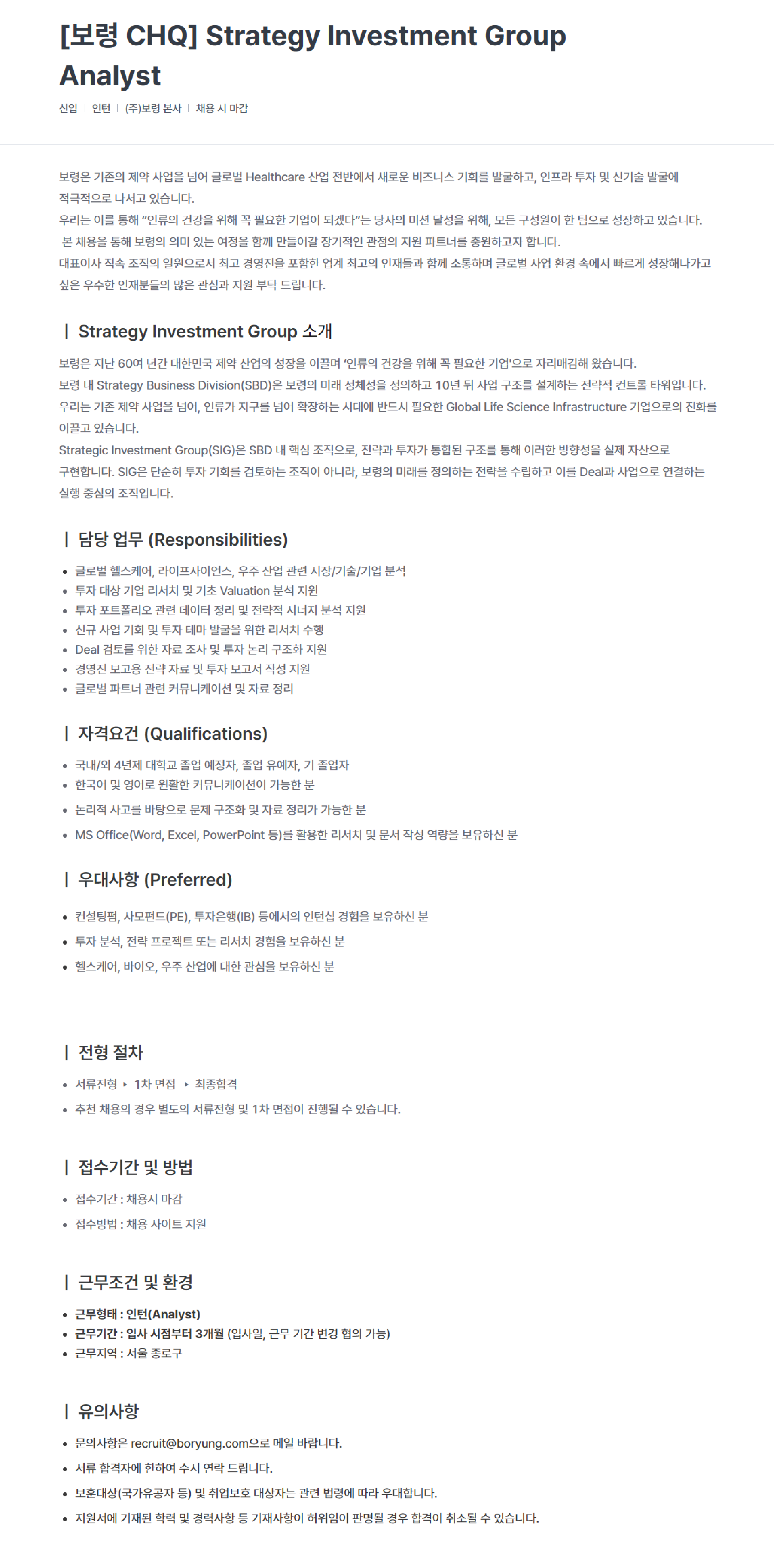 본 채용을 통해 보령의 의미 있는 여정을 함께 만들어갈 장기적인 관점의 지원 파트너를 충원하고자 합니다.