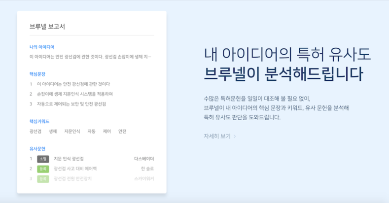 “반면 브루넬은 ‘얼굴이 발갛게 달아올랐을 때 바르는 피부진정크림’이라든지 키워드 방식이든지 이용자가 별다른 검색 기술 없이 평소 표현 그대로 입력해도 아무 상관이 없다. 자체 알고리즘이 그 내용과 의미, 기술 분야를 파악해 유사특허를 빠르게 찾아줄 수 있다.”
