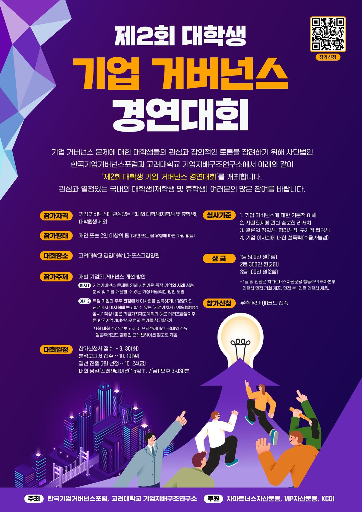 기업 거버넌스 문제에 대한 대학생들의 관심과 창의적인 토론을 장려하기 위해 한국기업거버넌스포럼과 고려대학교 기업지배구조연구소에서 아래와 같이 '제2회 대학생 기업 거버넌스 경연대회'를 개최합니다. 관심있는 여러분의 많은 참여를 바랍니다.